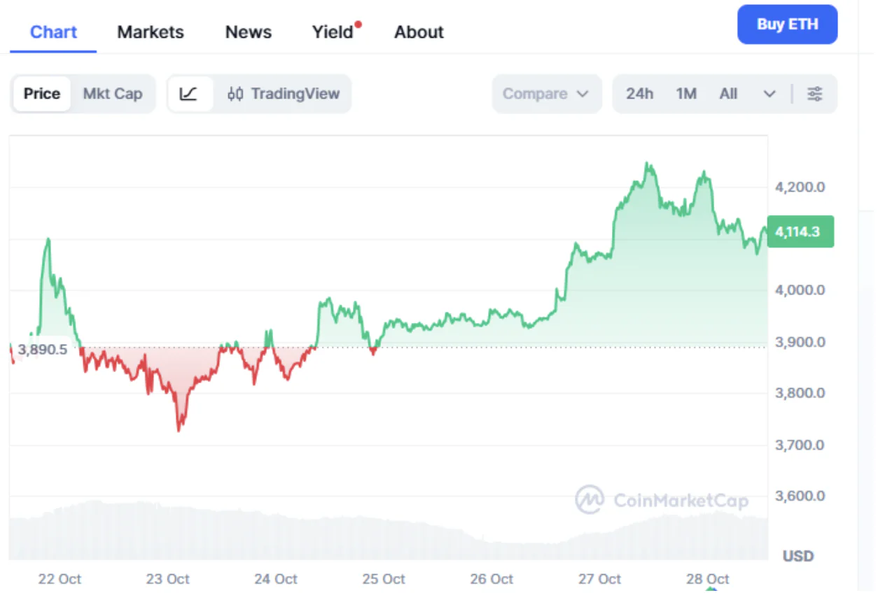 现在是投资2025年主流加密货币的最佳时机吗?以太坊(ETH)在市场上一路高歌猛进,今日价格达到4,116.16美元,过去一周上涨了5.98%,显示出投资者信心的不断增强。这种增长主要得益于机构投资者的采用、以太坊2.0的升级以及对去中心化应用(dApp)日益增长的需求。