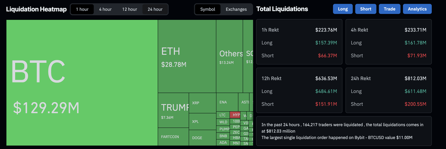 CoinGlass 数据显示,过去 24 小时内,共有 8.1203 亿美元的头寸被清算,其中多头清算 6.1148 亿美元,空头清算 2.0055 亿美元。