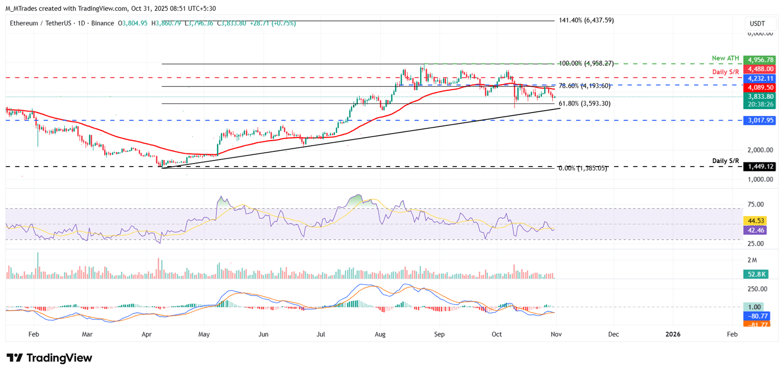以太坊价格在4232美元的日线阻力位遭遇拒绝。周一开盘后,以太坊价格下跌,到周四已下跌 8.86%。截至周五发稿时,以太坊价格徘徊在 3,833 美元左右。