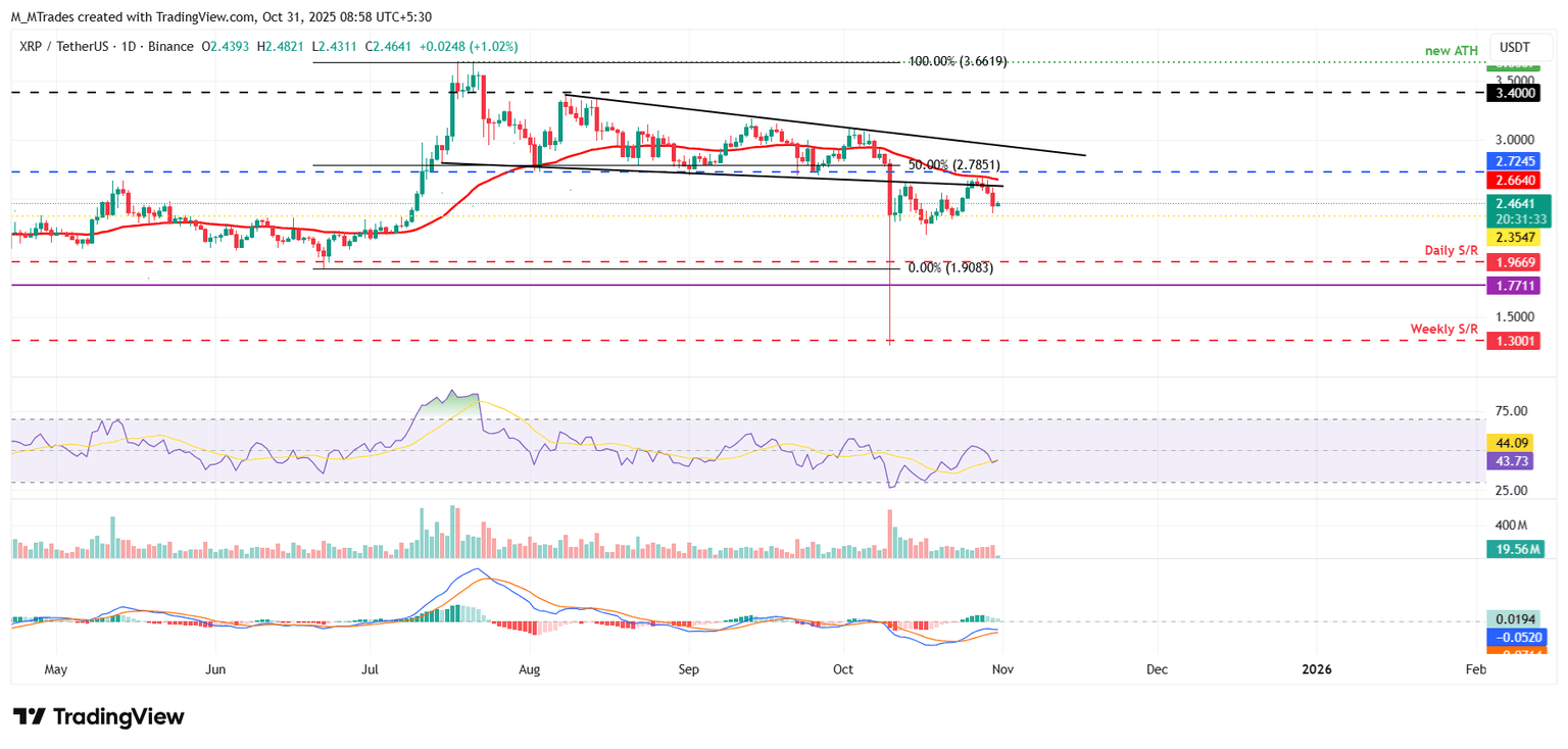 周一,XRP价格在2.66美元的50日均线附近遭遇阻力,下跌近8%,直至周四才反弹,并重新测试2.35美元的日线支撑位。截至周五发稿时,XRP价格在2.46美元附近徘徊。
