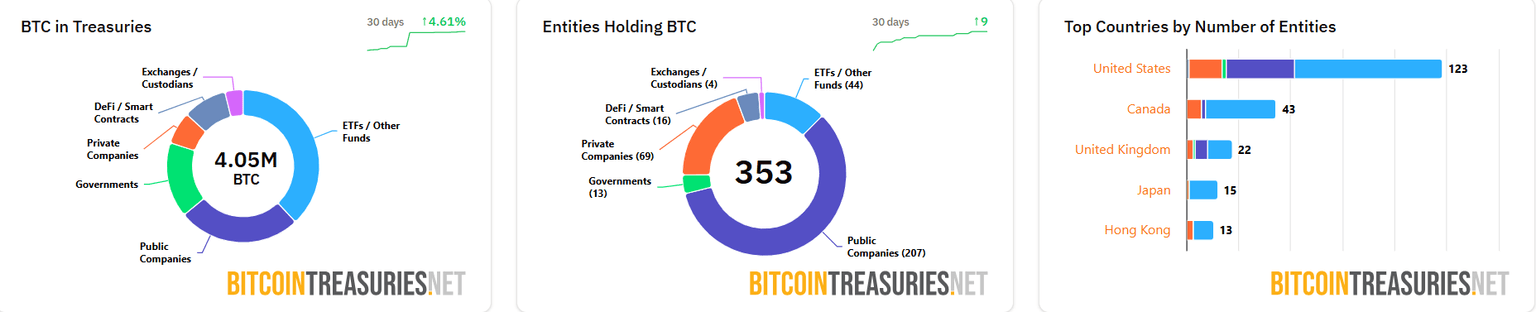 根据 BitcoinTreasuries.net 的数据,超过 353 个实体共持有约 405 万枚比特币,约占比特币当前流通供应量 1994 万枚的 20.31%,以及比特币总供应量 2100 万枚的 19.3%。