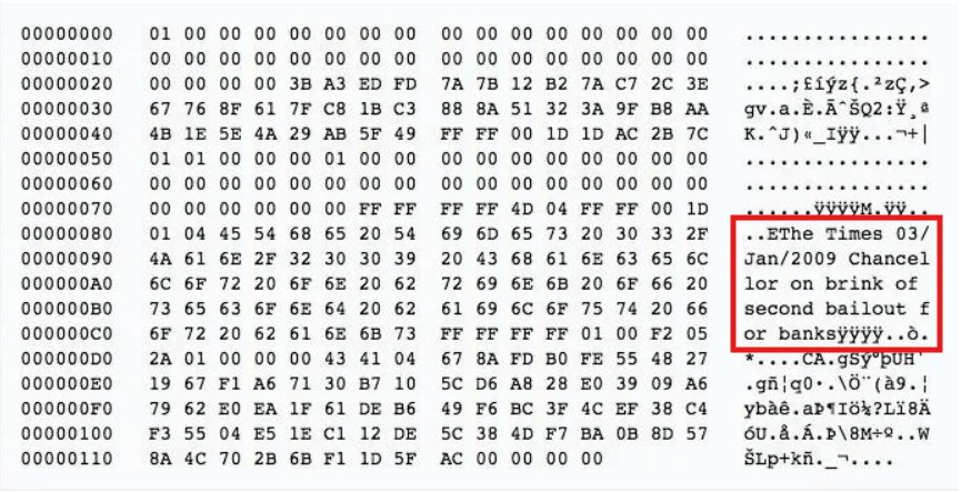 创世区块上的这条信息,正是《泰晤士报》关于英国应对2007-2008年金融危机的头条新闻。中本聪公开反对“大到不能倒”的金融机构,并希望比特币能够有所不同。