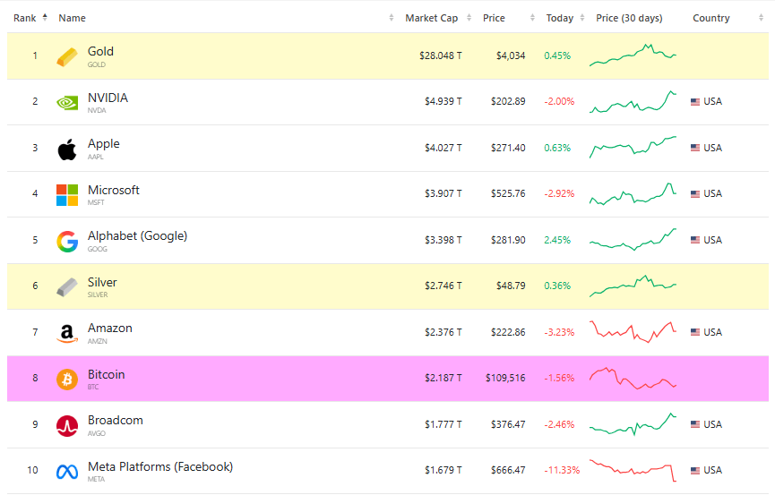 比特币曾经是密码朋克隐私和去中心化理念的代名词,如今已与传统资产并驾齐驱,跻身全球最大投资者的投资组合。其当前市值已超过 2.18 万亿美元,在全球市值最高的资产中排名第八,超过了博通和 Meta Platforms 等顶级公司,如下图所示。