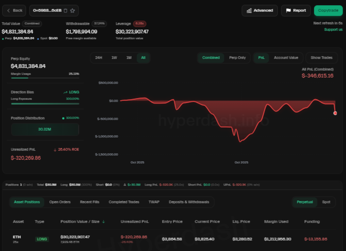 根据最新的 Hyperdash 数据该交易员从 10 月 29 日开始建立 ETH 多头头寸。