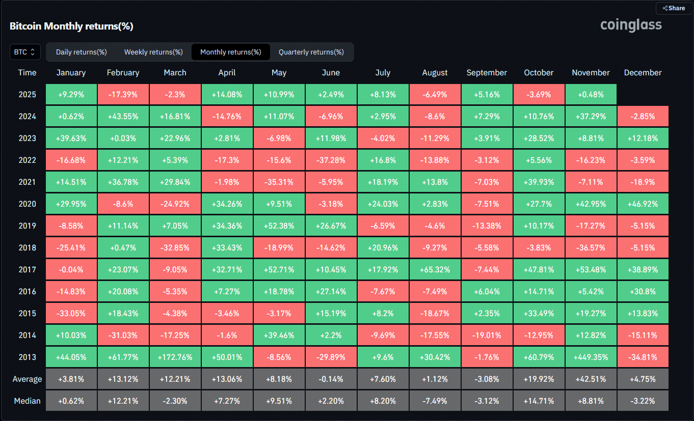 展望未来,11月历来是比特币表现最强劲的月份之一。CoinGlass数据显示,自2013年以来,11月比特币的平均回报率为8.81%,其中2020年、2021年和2023年的涨幅均达到两位数。