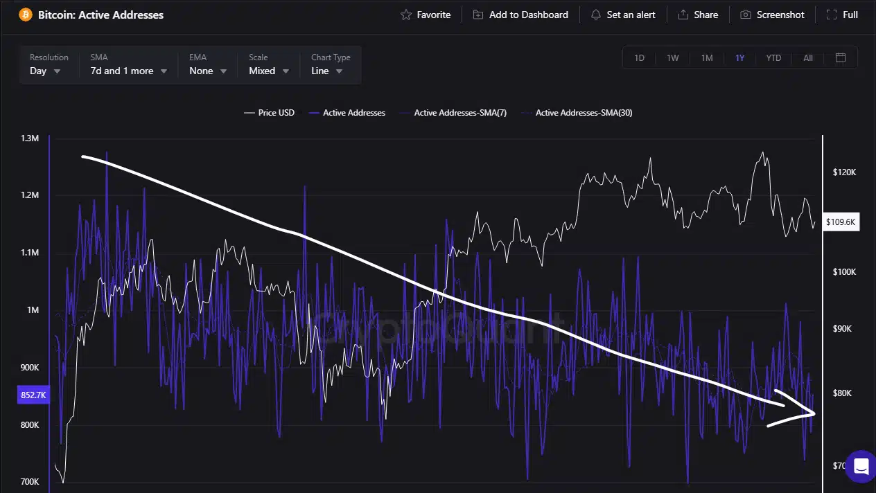 与通常的正面效果不同,比特币 [BTC]股价下跌,零售兴趣也随之消退。随着恐慌情绪蔓延,网络活动正在放缓。