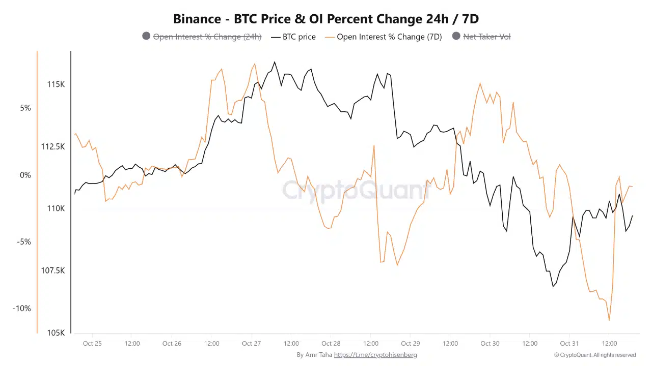 未平仓合约几乎跳了起来7 天内上涨 10%,从 79.5 亿美元攀升至 86.5 亿美元,比特币交易价格接近 11 万美元,但与此同时,CVD 大幅下降。