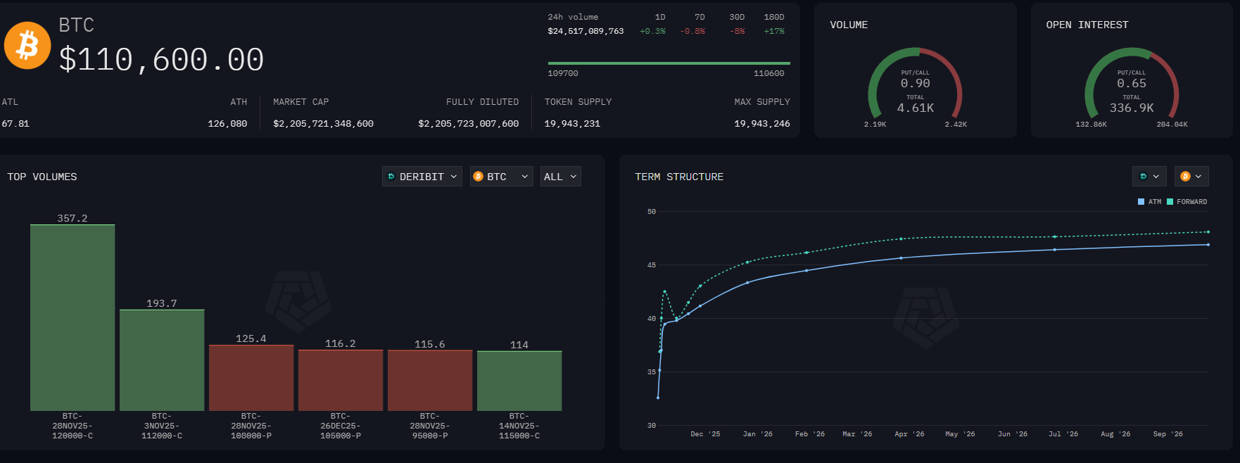 值得注意的是,在 112,000 美元至 120,000 美元附近,看涨期权交易量较大(绿色柱状图),表明短期内(11 月底)市场有看涨倾向。