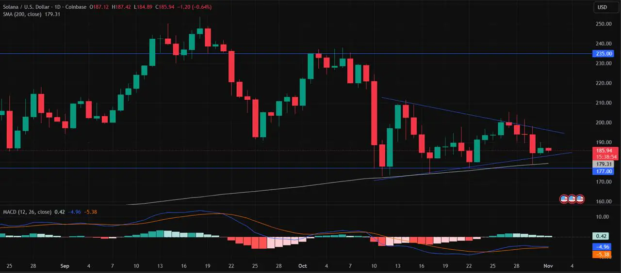 “>波动性10月份,SOL股价在180美元至235美元之间波动。过去30天,SOL股价下跌超过16%,目前交易价格为185.79美元。过去三周,SOL股价一直呈对称三角形形态交易,表明市场犹豫不决。