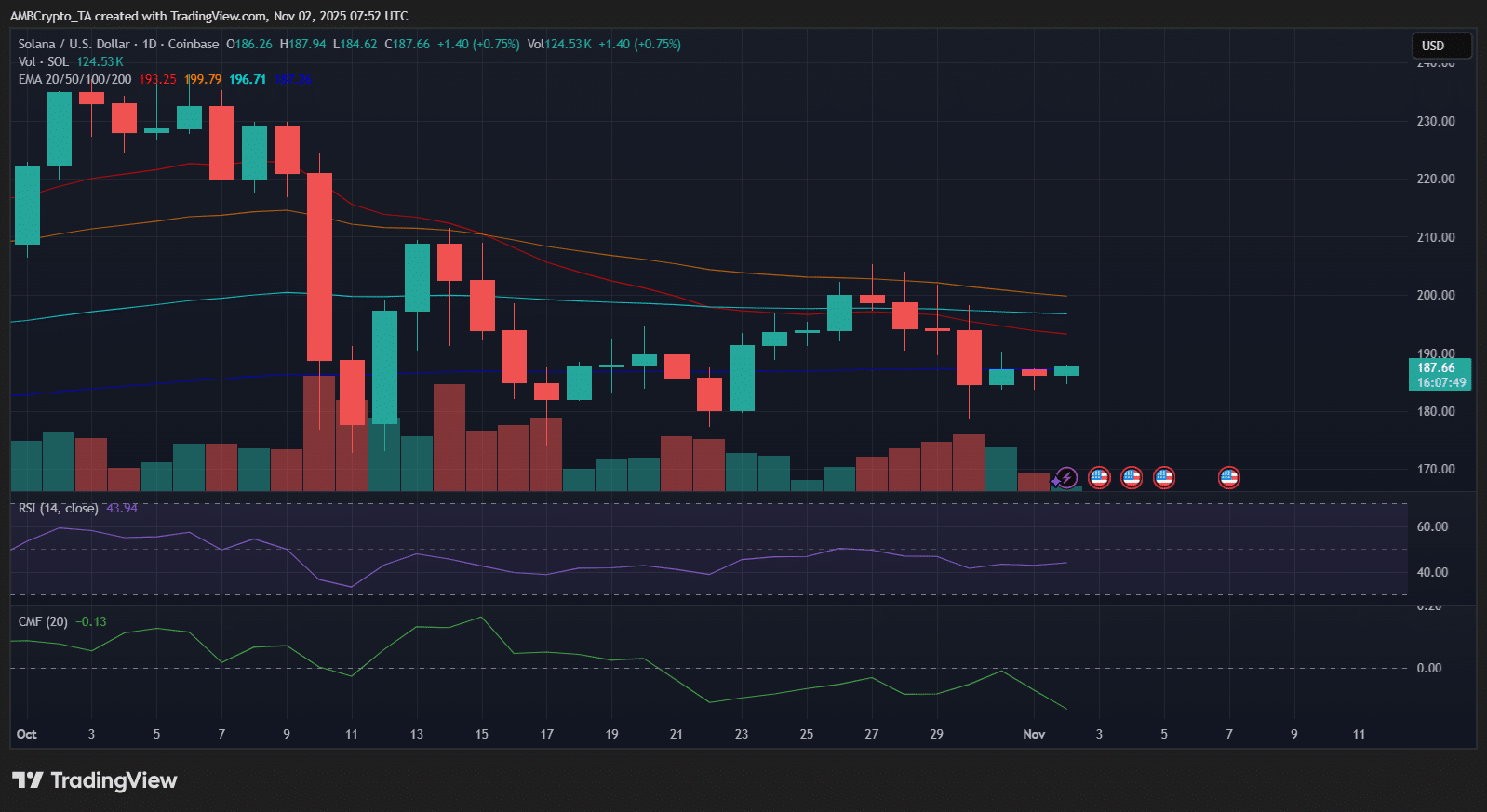 从日线图来看,SOL 股价仍维持在 180-195 美元的窄幅区间内,RSI 指标接近 44,CMF 指标略微为负。这意味着需要谨慎操作。