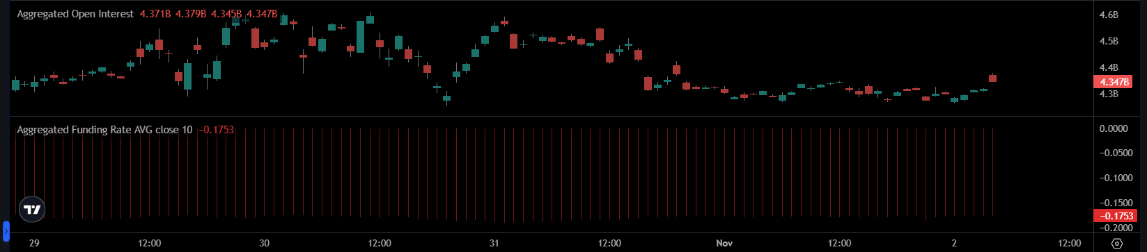 衍生品数据显示,未平仓合约量已从高位回落,平均融资利率维持在-0.17左右的负值水平。这意味着交易员倾向于做空,并且需要支付做空成本。