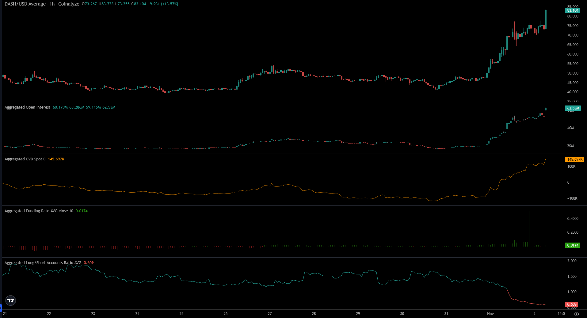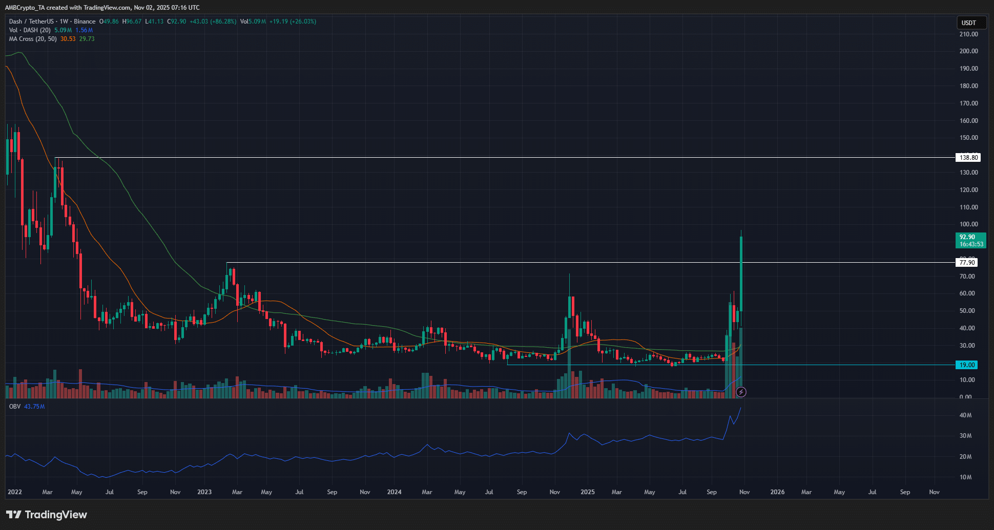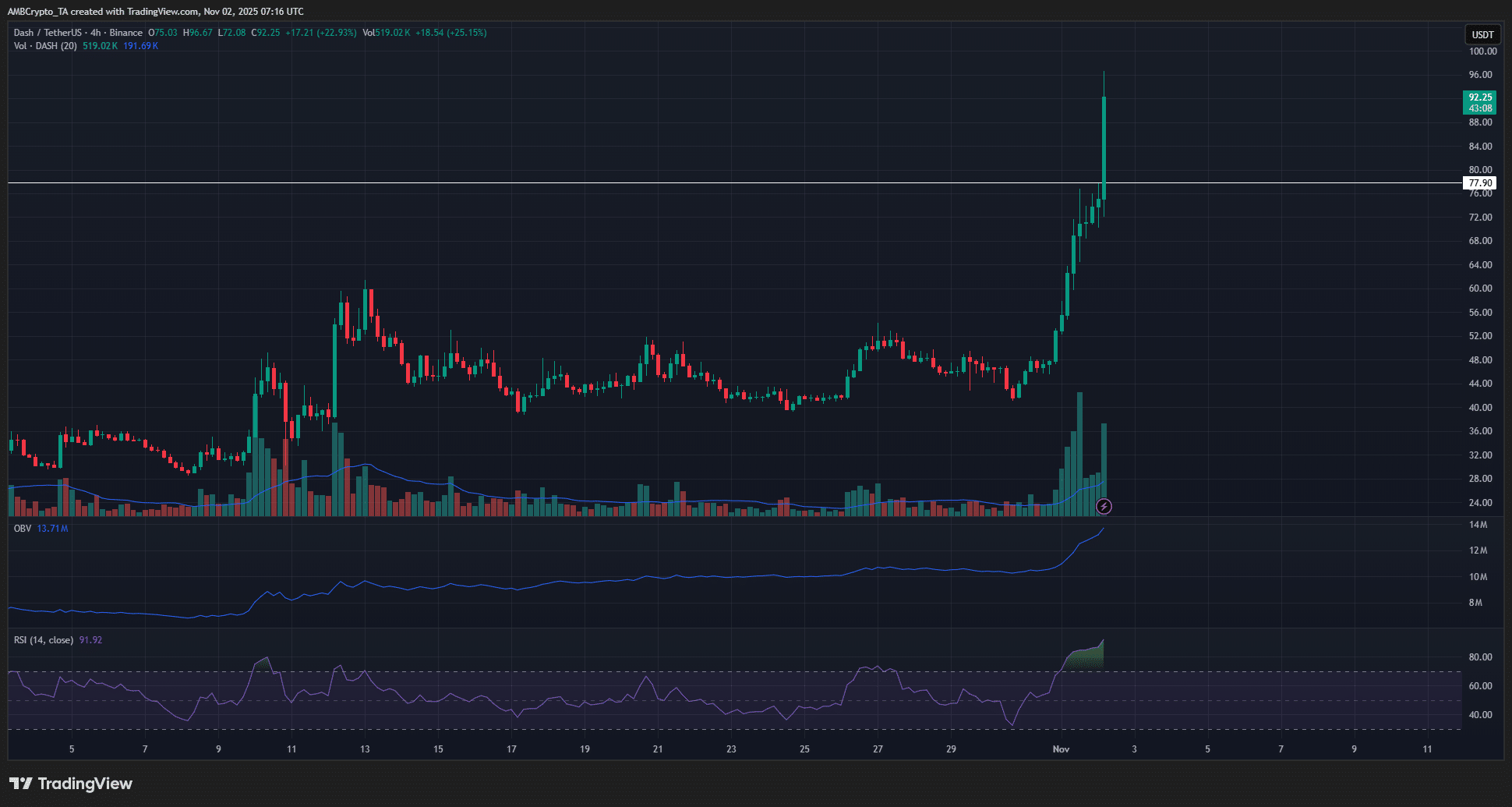 短划线 [DASH]过去24小时内,股价上涨了49.7%,突破了2023年初以来的77.9美元阻力位。与此同时,ZCash [ZEC]股价反弹至 449.8 美元的高位,这是自 2018 年以来的最高水平。