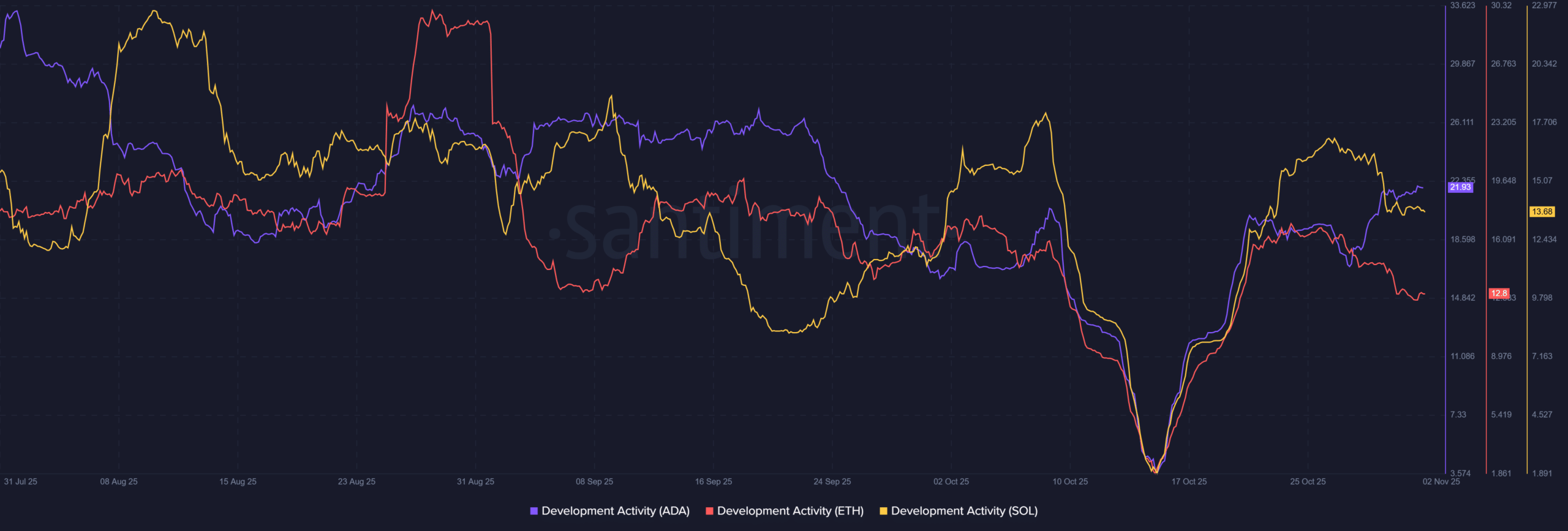 然而,Santiment 的数据显示,Cardano 的发展活动指数在 10 月下旬超过了 ETH 和 SOL,证明了其持续的建设者势头。