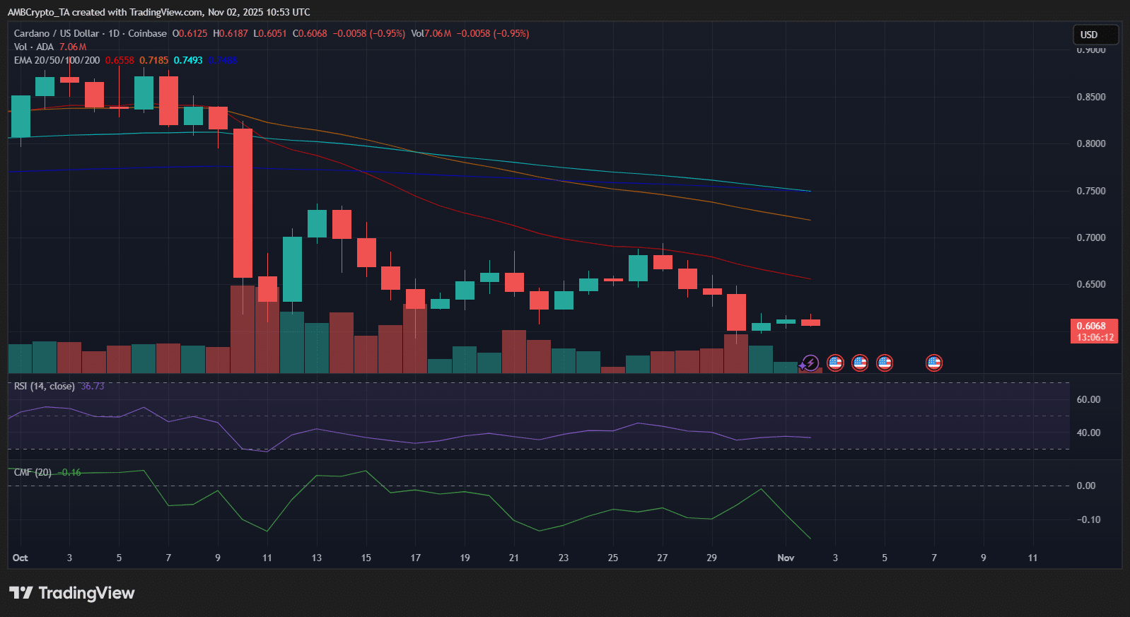 截至发稿时,ADA股价在0.60美元附近波动,走势依然疲软。价格持续低于所有主要指数移动平均线(EMA),其中20日EMA接近0.65美元,50日EMA接近0.71美元,200日EMA接近0.74美元。