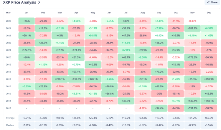平均而言,11 月份加密货币的月度收益率最高,达到 81.2%。这远高于 12 月份的 69.6%,使其成为最高的月份。XRP投资者获利颇丰的一个月因此,就价格快速上涨而言,这种数字资产很可能在11月份经历这一过程。