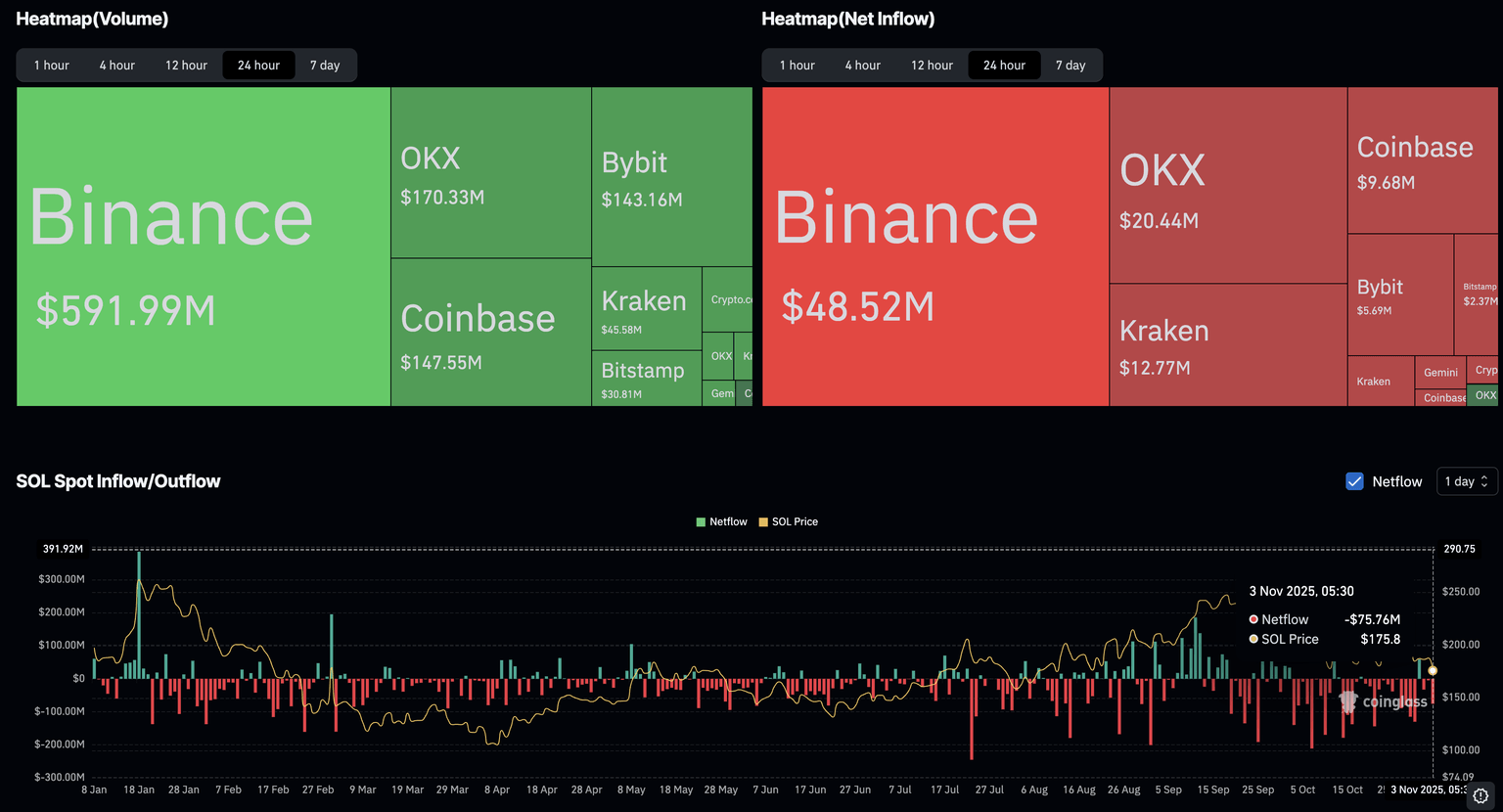 SOL现货净流量。数据来源:CoinGlass。