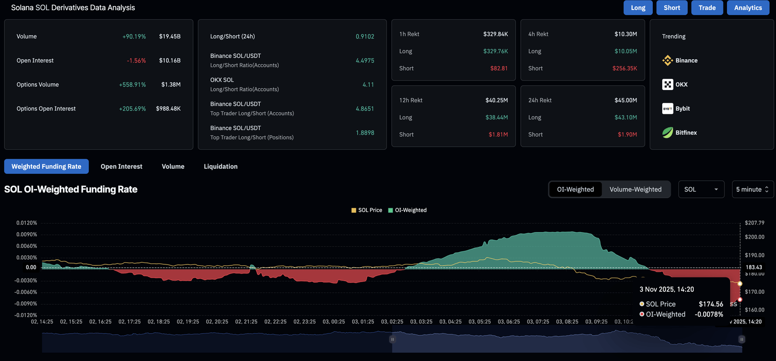 截至周一发稿时,Solana (SOL) 价格下跌超过 6%,在跌破 200 日指数移动平均线 (EMA) 后,正向 174-177 美元的支撑区域施压。衍生品数据显示,交易员普遍看跌,预期价格将进一步下跌。