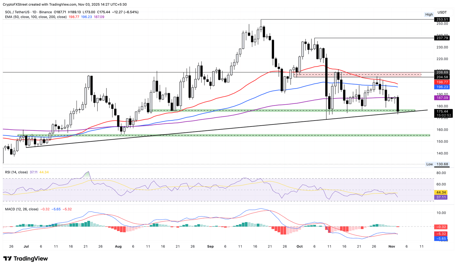 截至周一发稿时,Solana 的交易价格为 175 美元,盘中下跌超过 6%,面临跌破 174-177 美元需求区和连接 7 月 1 日和 10 月 10 日低点形成的支撑趋势线的风险。