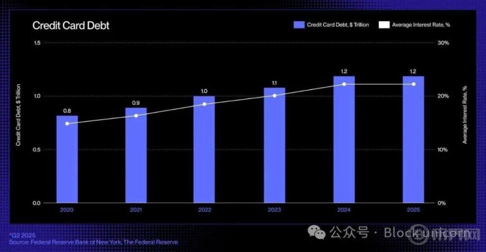 在美国,最主要的无担保借贷形式是信用卡:这种无处不在、流动性强且即时可用的信贷工具允许消费者在购物时无需提供抵押品即可借款。信用卡未偿债务持续增长,目前已达到约 1.21 万亿美元。