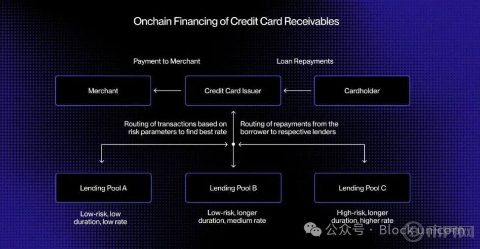 想象一下,一位消费者购买了价值 5,000 美元的商品。交易立即获得授权。在与 Visa 或 Mastercard 结算之前,发卡机构会将应收账款在链上代币化,并从去中心化信用池中收到价值 5,000 美元的 USDC。结算完成后,发卡机构会将这些资金发送给商家。