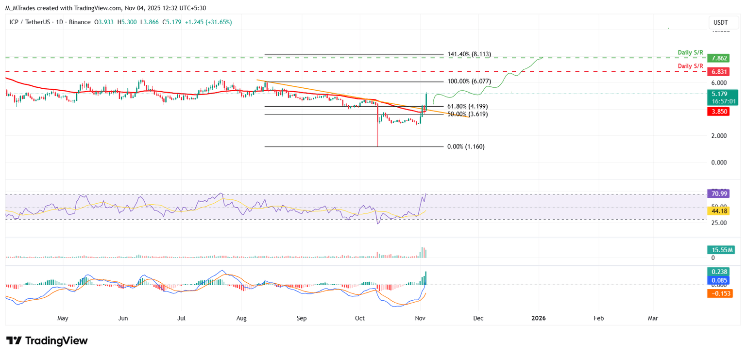 周日,Internet Computer (ICP) 股价突破了下降趋势线(该趋势线由 8 月中旬以来的多个高点连接而成),并在次日于该趋势线附近获得支撑。截至周二发稿时,ICP 股价已上涨超过 30%,交易价格高于 5.17 美元。