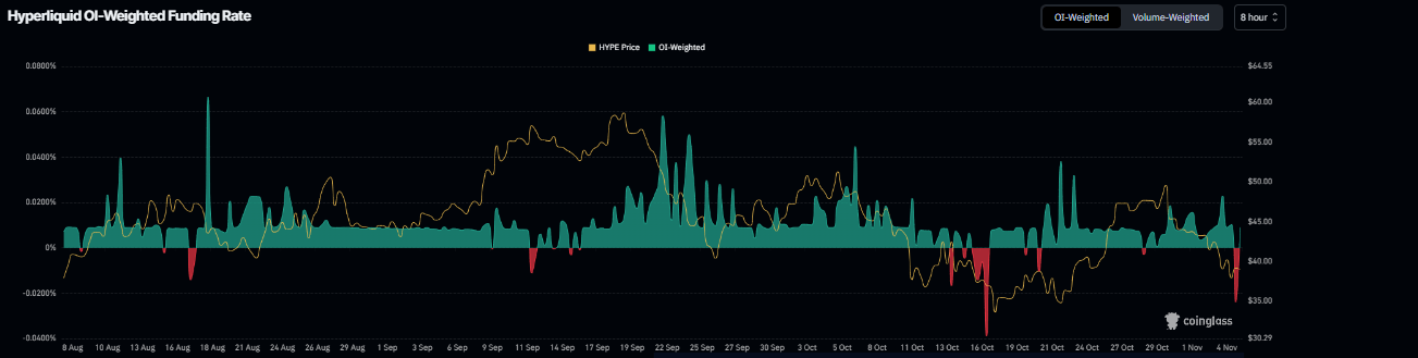 除了巨鲸的买入之外,衍生品数据也支持 Hyperliquid 的反弹行情。Coinglass 的未平仓合约加权资金率数据显示,押注 HYPE 价格将进一步下跌的交易者数量低于预期价格上涨的交易者数量。