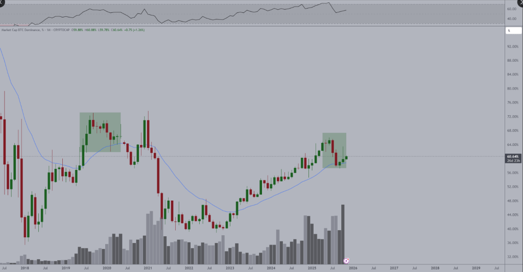 比特币的市值占比目前为 60%,并且一直在测试一条重要的长期支撑线。据市场资深人士 Michaël van de Poppe 称,这条支撑线——位于 59% 附近的 20 个月移动平均线——是交易者应该关注的信号。