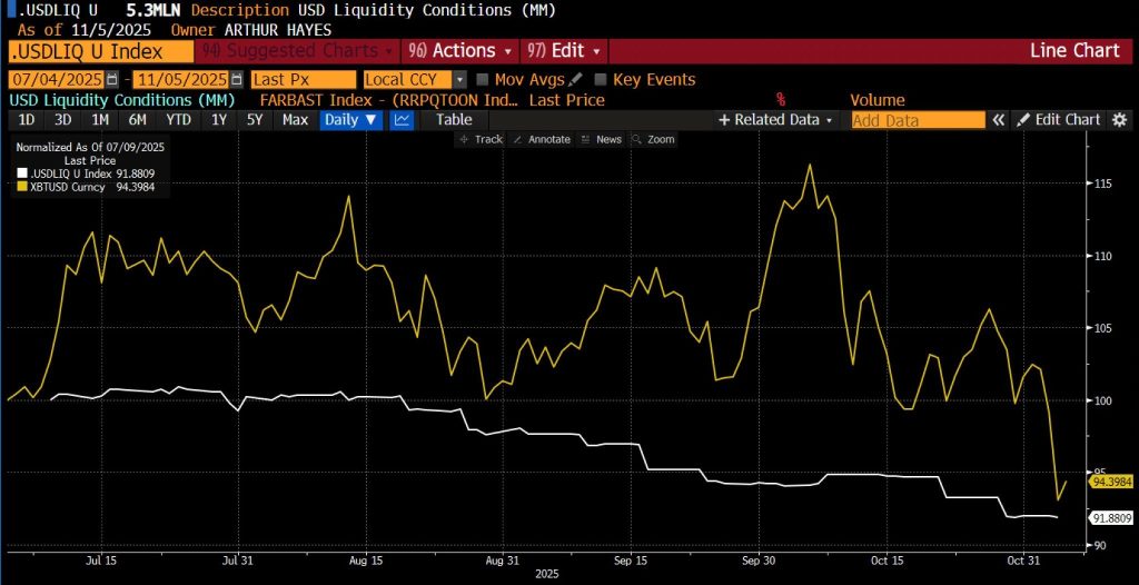 图表显示,美元流动性指数(白线)在10月和11月初呈急剧下降趋势,反映出金融体系中美元流动趋紧。历史上,比特币(黄线)的走势与流动性变化密切相关,在经济扩张阶段走强,在流动性收缩阶段走弱。