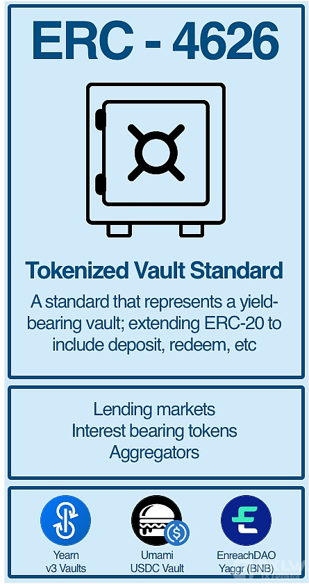 ERC-4626 是最新的代币标准,描述着有收益的金库。该标准为存入金库(或从金库赎回)的 ERC-20 代币提供了一个共同接口,以获得收益。这可以包括流动性挖矿和聚合,但还可以用到更多领域中。