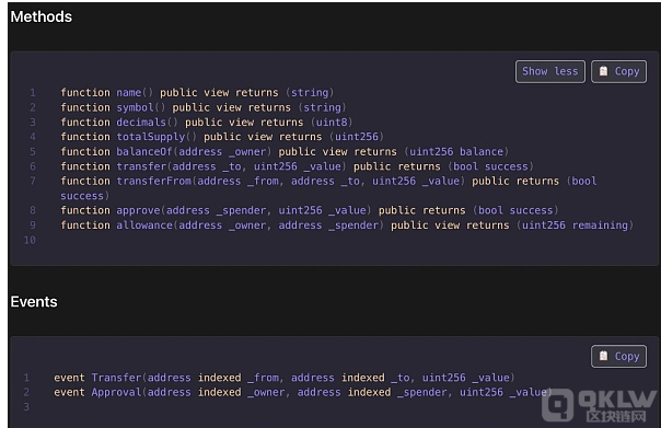 这是 ERC-20 的代币模板。为了生成一个 ERC-20 智能合约,开发者需要创建用来执行下面所有的方法和事件的代码。