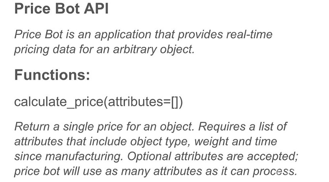 这就是价格机器人的 API:一个价格机器人支持的函数列表和如何使用他们的说明。这是一个示意图,由此开发者可以在无需掌握应用程序的情况下集成它。假设这个例子是真实的,那么这个 API 的文档应该是这样的: