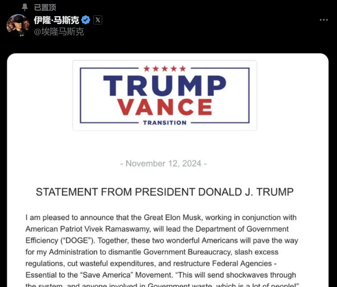 2. 特朗普在声明中任命马斯克和维维克为政府效率部门的领导人@elonmusk