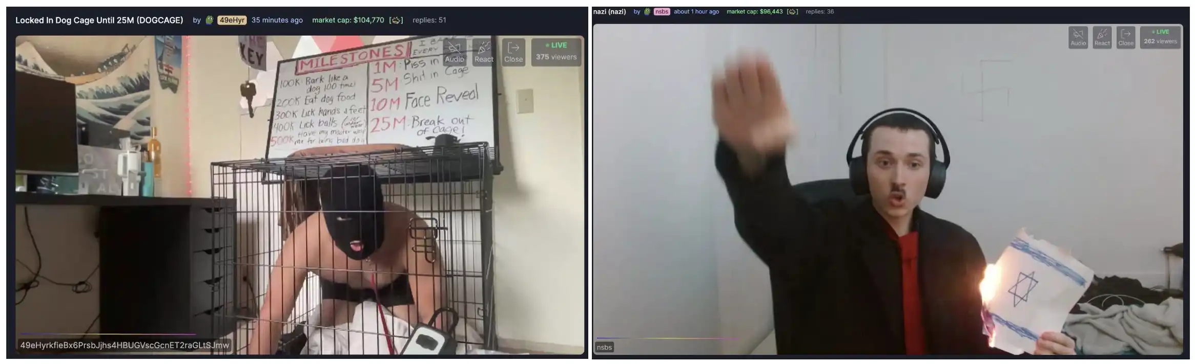 裸体直播、人兽大战、把自己关在笼子里当狗,甚至是虐待儿童、宠物、模仿纳粹等各种极端无下限内容频繁出现,这几天,Pump.Fun 上掀起了一波低俗直播发币潮,引起业内围观与讨论,社区有人戏称「今年两个 Killer App 一个已经被 FBI,另一个很快要被 FBI」。