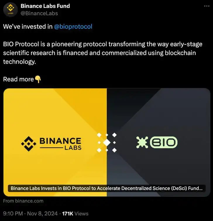 Binance 投资了 Bio,Bio 是一个跨所有这些 DAO 代币的指数代币。如果你觉得 DeSci 很有前景,但不关心脱发或者长寿,你可以选择投资 Bio 代币,因为 Bio 基本上是这些代币的流动性代币。希望这样解释能让你理解。