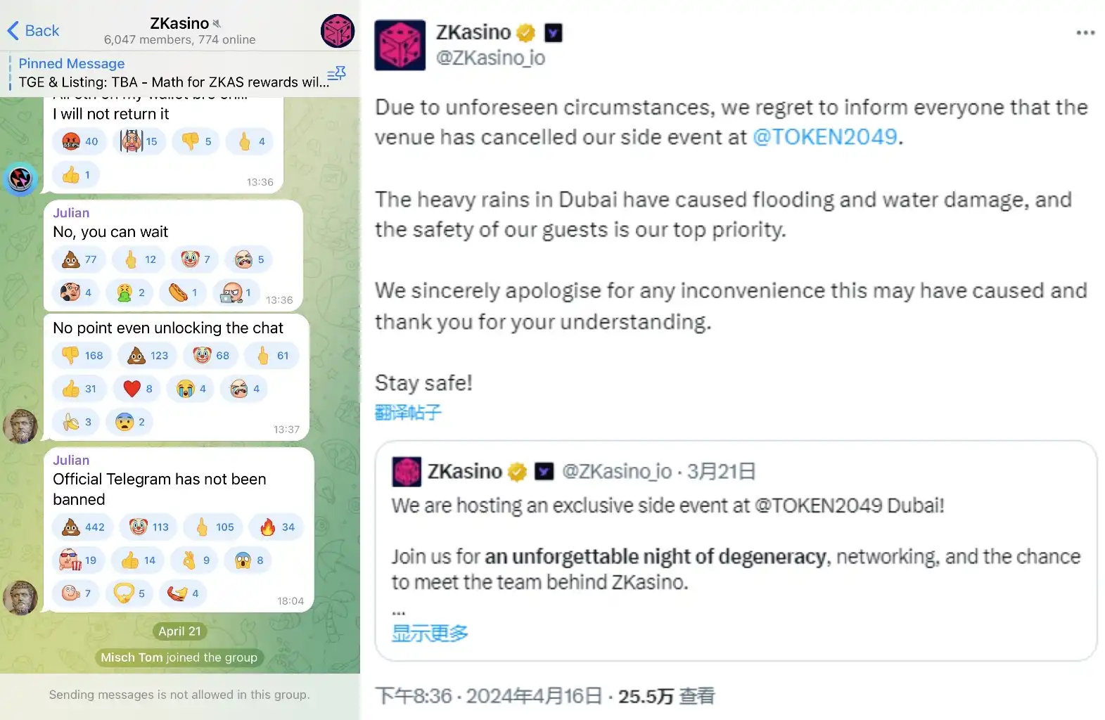 时间回到 4 月 19 日,多名社区用户发现在 ZKasino 质押活动结束之后,迟迟不开放 ETH 退款。随后通过 Wayback Machine 回溯,ZKasino 在 4 月 18 日将官网中 Bridge funds 页面中的「Ethereum 将被返还和可被桥接回去」这句话删除,引发用户恐慌,质疑其是否蓄谋「拿钱跑路」。参与质押活动用户纷纷涌入 ZKasino 官推质询,Telegram 同样成为维权阵地,不过没多久 ZKasino 团队成员就关闭了 Telegram 发言权限。