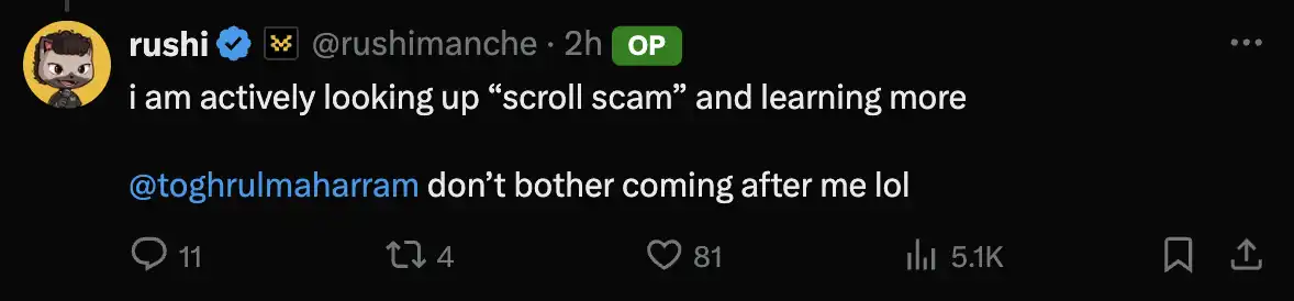 最后 Rushi 来了句「我正在积极搜索『Scroll 骗局』并深入了解更多内容。@toghrulmaharram 别想着来找我麻烦,哈哈。」