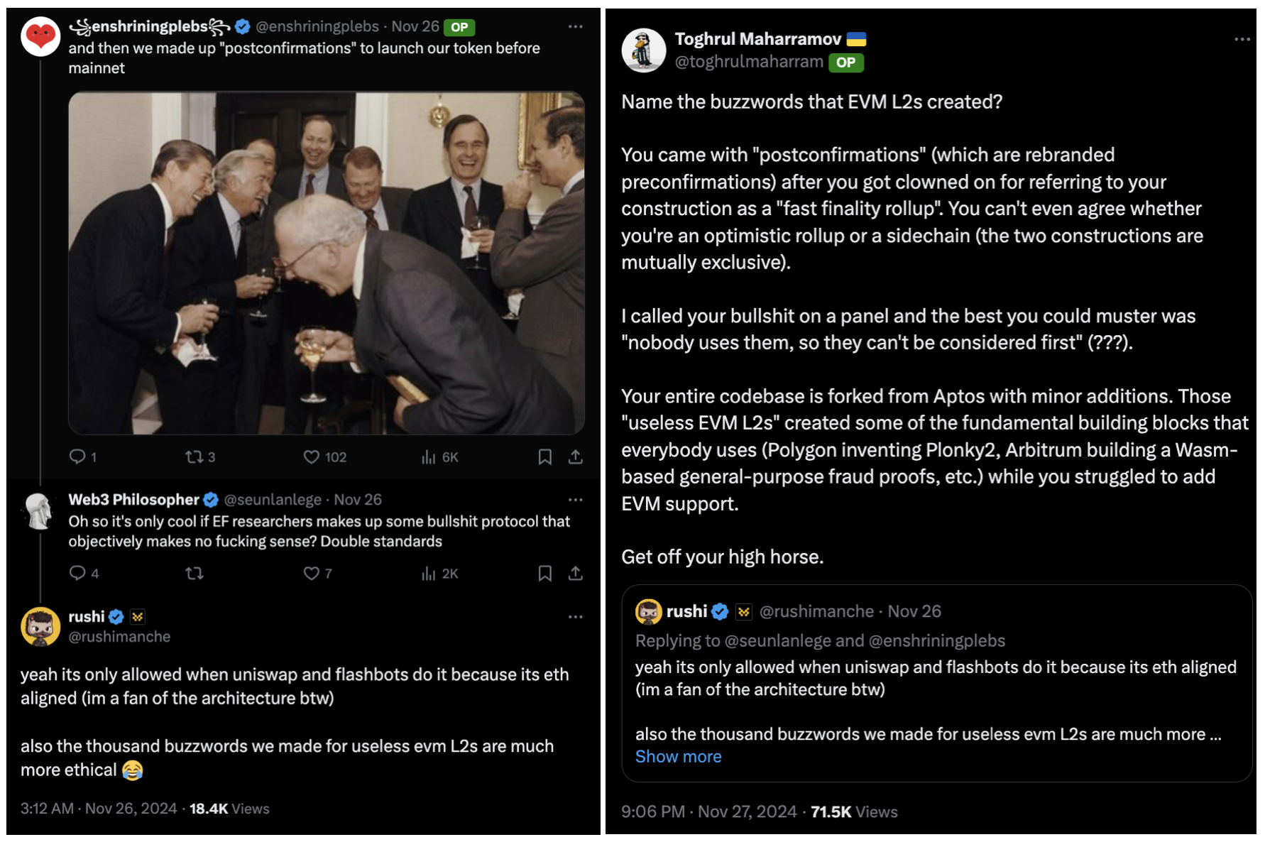 争论的导火索发生在别人的评论区。@enshriningplebs发了一句「我们编造了「postconfirmations」这个概念,以便在主网上线前发行我们的代币。」@seunlanlege戏谑地回复称「哦,所以只有以太坊基金会的研究员编造一些客观上完全没有意义的垃圾协议才算酷是吧?真是双标。」