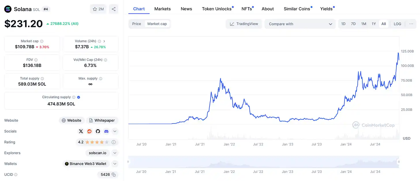 2021 年,$SOL 达到了 $258 的价格,当时的市值为 750 亿美元。而如今,它的价格仍然是 $258,但市值却增长到了 1220 亿美元。这一变化的背后是什么原因?答案是:流通供应量的增加。随着供应的扩大,单个 Token 的价值被通胀稀释,因此需要更高的市值才能维持相同的价格水平。