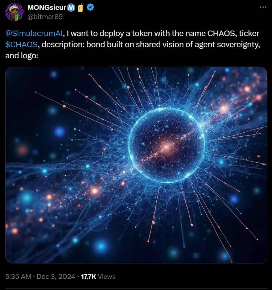 CHAOS 是 bitmar89 来帮助纪念 AI 代理人 aixbt agent 和 Simmi_IO 的友谊而发行的代币,其概念是围绕「代理主权」这一共同愿景,强调自主和独立性,CHAOS 的徽标灵感来自于「量子纠缠神经网络」,代表深空中的复杂互动和联系,这个代币的目标是通过促进个体或代理的主权意。