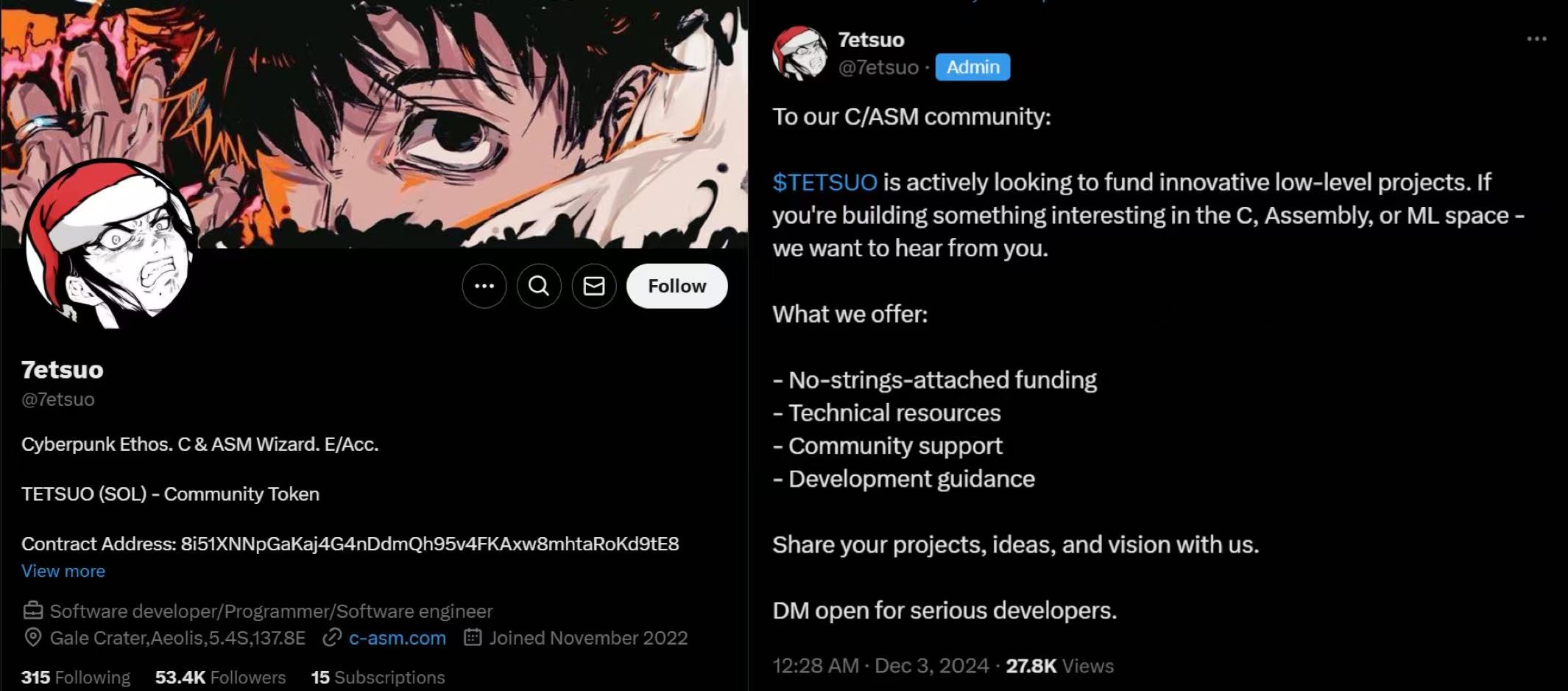 在 sol 行情冷淡两天后出现了一个 8 小时速通 30M 的 meme 币 TETSUO。TETSUO 的项目方是 7etsuo,愿景是将顶尖的编程效率与区块链技术结合,基本上类似于是一个孵化器,为新的 AI 创新应用程序和软件的资金来源为真实技术的开发提供资金。TETSUO 原本是动漫《AKIRA》中的反派名字,头像和背景也是赛博朋克风格