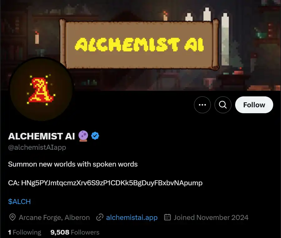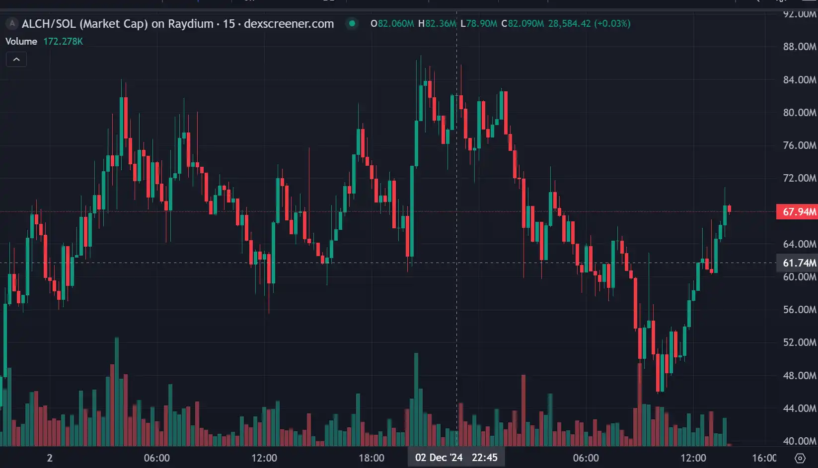 ALCH 是一个利用 AI 技术帮助用户实现创意与实际应用结合的平台,例如查看新闻、股票、天气、地图、社交媒体以及许多其他 API 服务,还可以整合 Marketplace,用户可以出售或打赏各种作品。这是 11 月 28 日凌晨创的池子,然后 30 日早上 9 点就极速上架 moonshot,引起的热度持续不减,昨晚九点达到最高市值 87M。