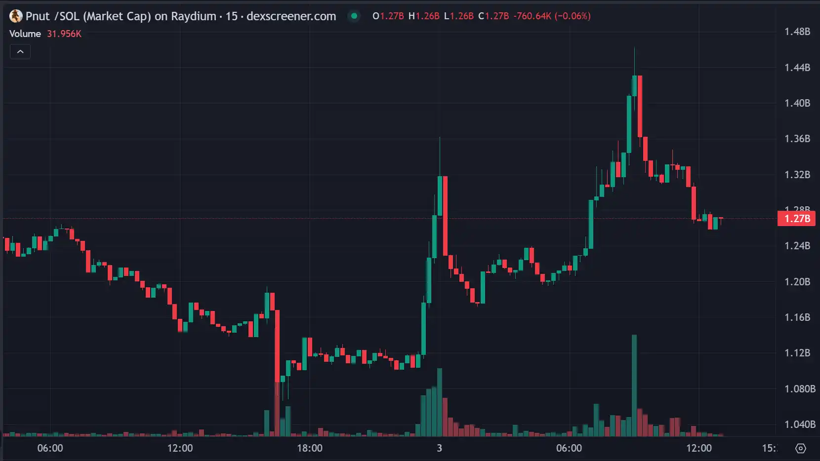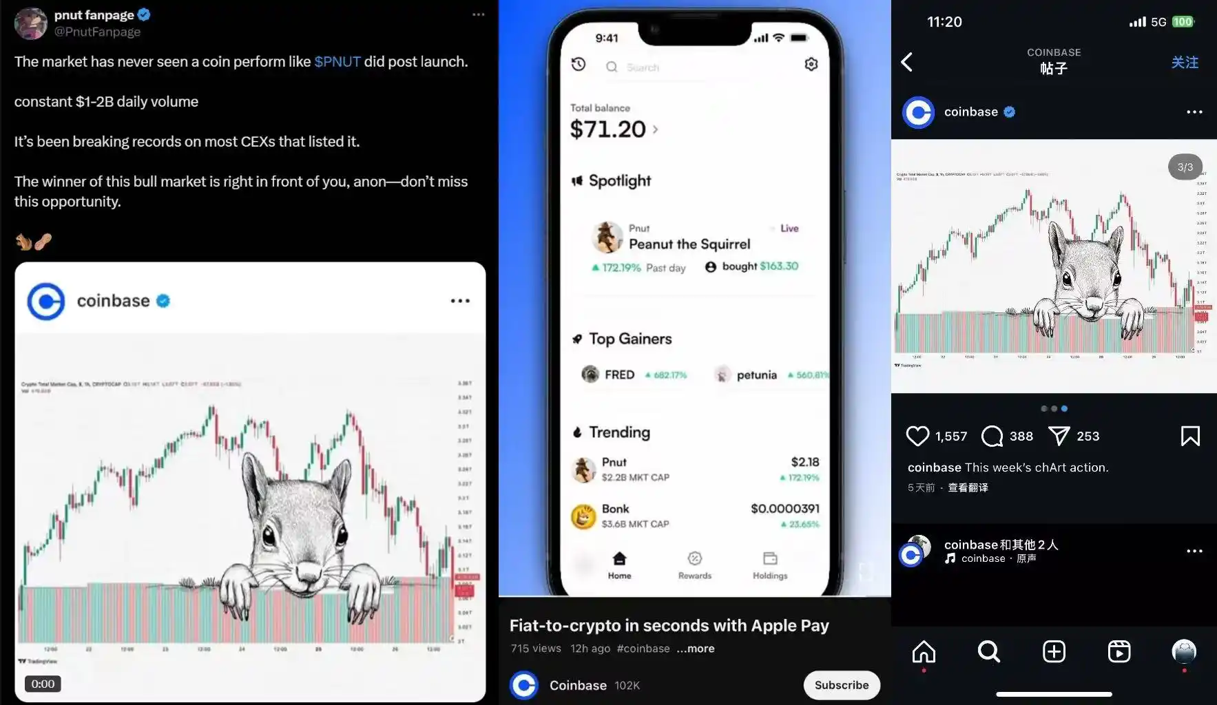 PNUT 被网友称为市场上从未见过的代币表现,每日 1-2B 的恒定交易量在加上被 coinbase 暗示将上线交易所,价格大涨,代币昨日涨幅超 30 倍,市值最高突破 1.4 亿美元,但目前已经据高点回落 13%。