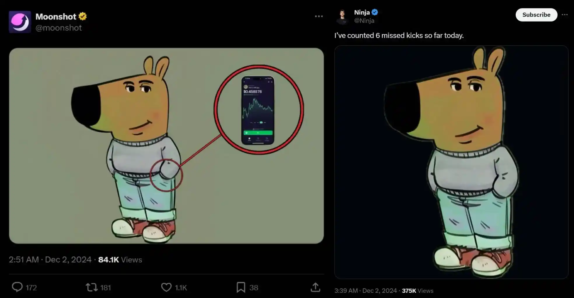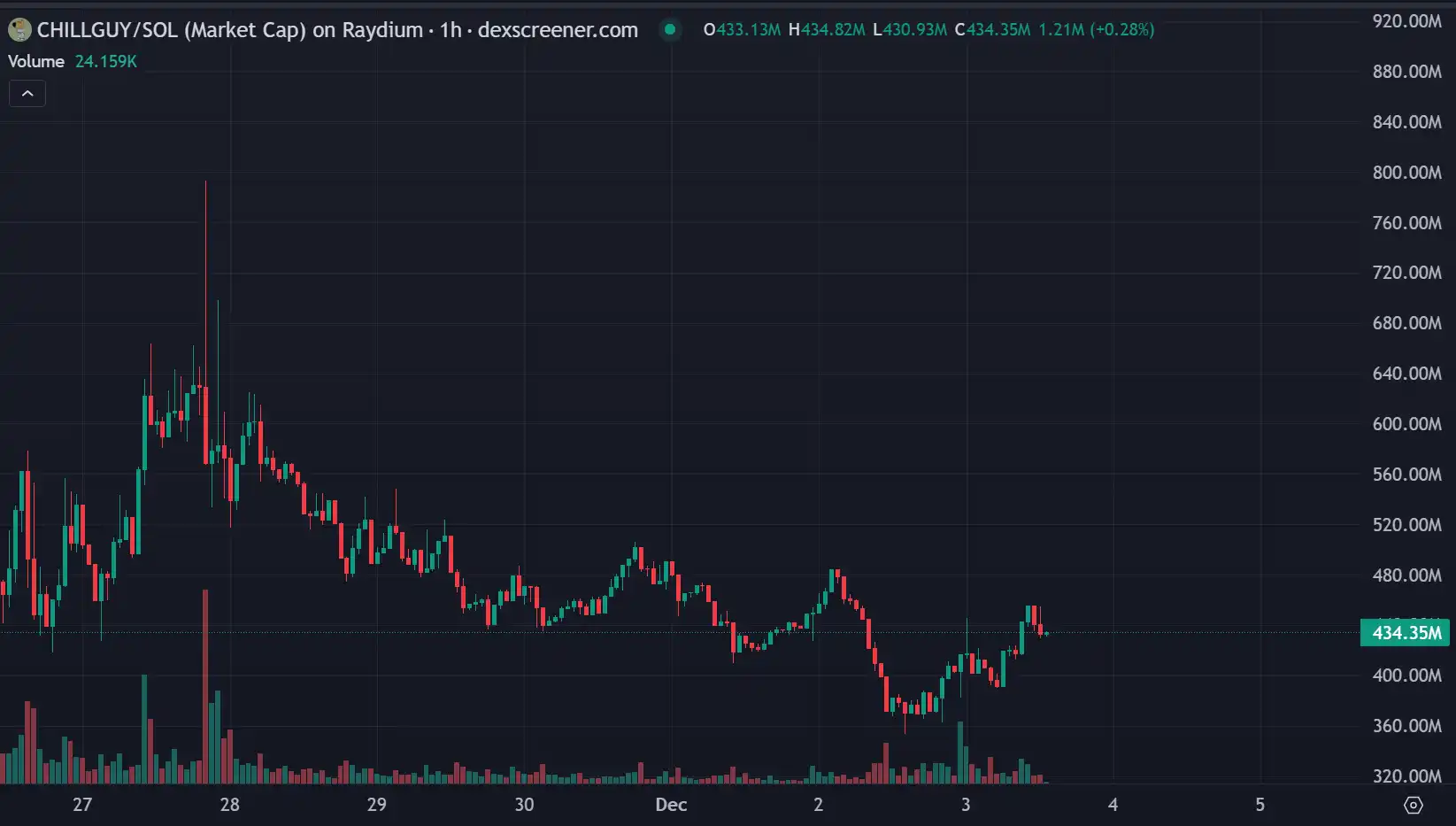 一周前 Chillguy 达到最高市值将近 8 亿美元,随后开始回调到 5 亿左右震荡,最低到 3.6 左右的市值,现在交易量不断回升到 38.5M,重回 solana 排行榜的前五宝座。众多网友呼吁 chillguy 能够上 moonshot 和币安,著名的电子游戏公司 nutcasemilk 联合创始人也为 chillguy 打 call。