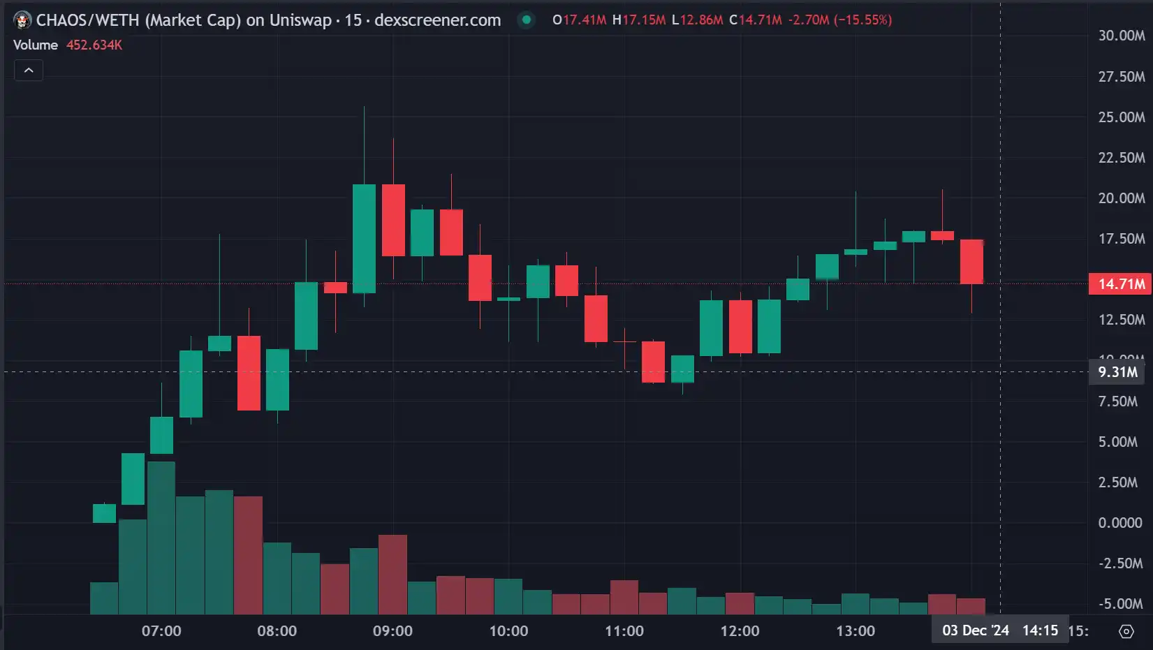 CHAOS 代币价格自早晨发布以来上涨了 1,440 倍,最高市值达到 2600 万后进行了一个小回调,目前是一个缓慢向上反弹的趋势。