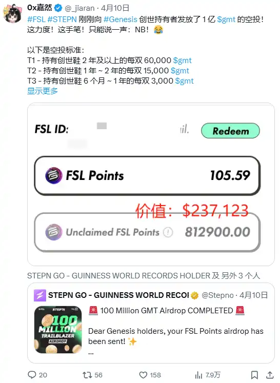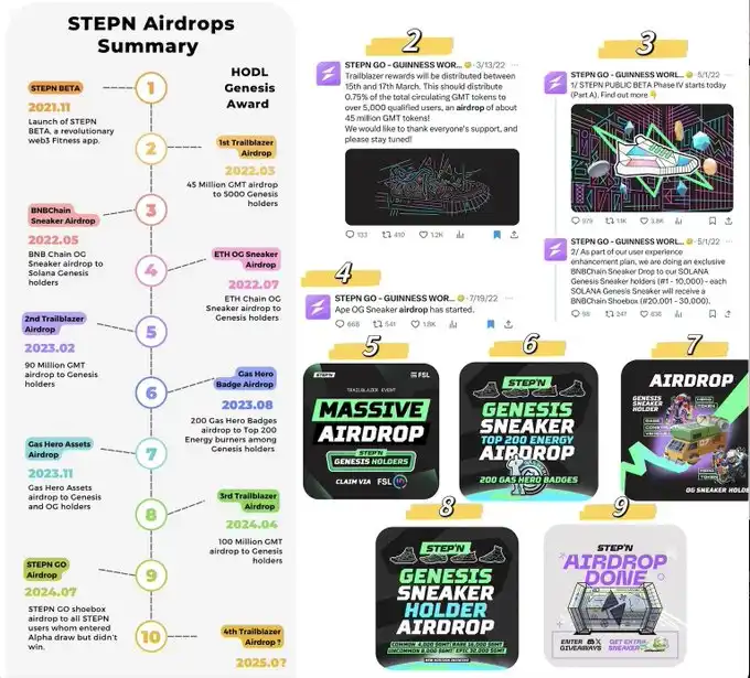 过去三年里,对于手握 Genesis Sneaker 的用户和持续坚持运动的忠实老玩家,FSL 一直毫不吝啬地赠与丰厚空投,这份坚持如同一条穿越熊市的生命线。空投不愧是次好的信仰充值方式(仅次于拉盘),早期创世持有者的累积收益甚至至少达到了 20 倍之多。
