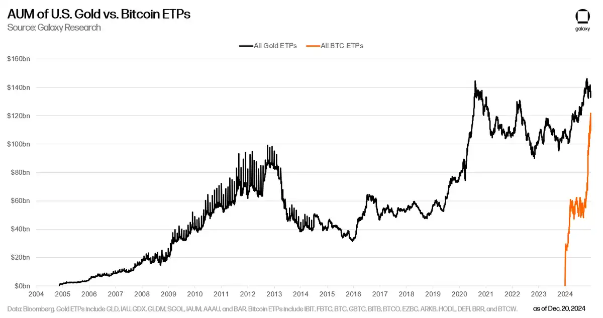 2024 年,比特币 ETP 产品吸引了超过 360 亿美元的净流入,成为历史上表现最好的 ETP 产品组合。许多全球顶级对冲基金(如 Millennium、Tudor 和 D.E. Shaw)都选择了比特币 ETP,而根据 13F 文件显示,威斯康星州投资委员会 (SWIB) 也持有相关仓位。短短一年内,比特币 ETP 的 AUM 距离超越美国所有实物黄金 ETP 的总规模仅差 240 亿美元(19%)。