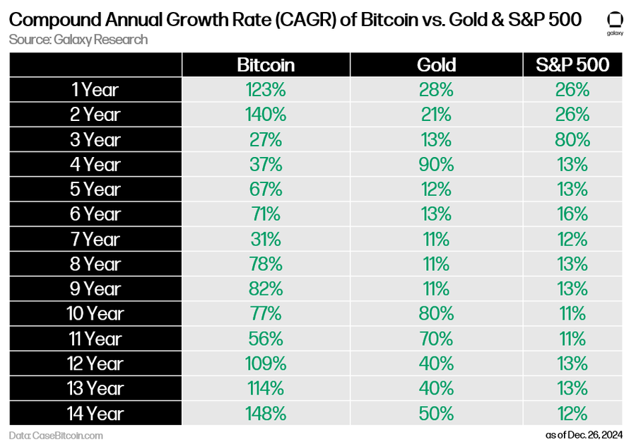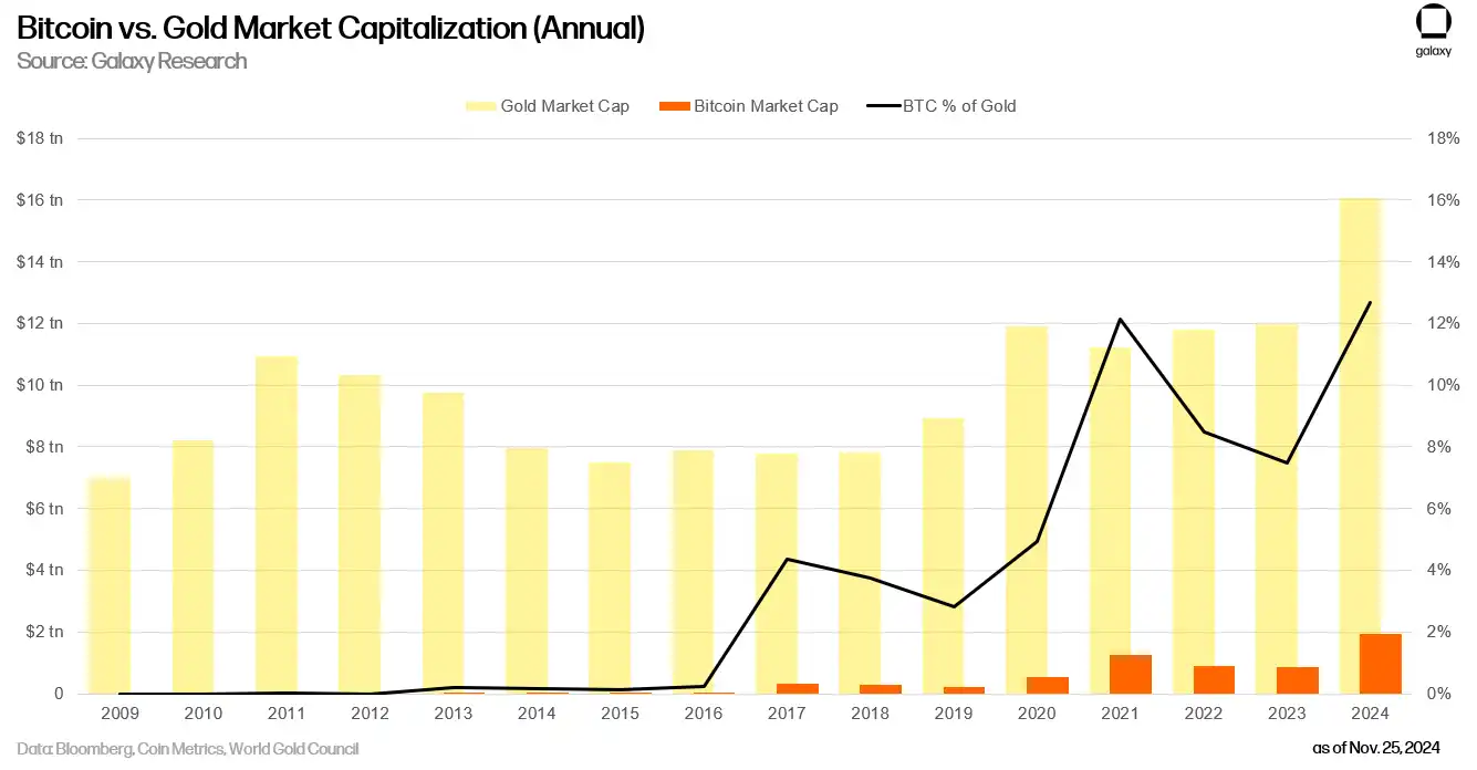 机构、企业以及国家层面的采用将成为推动比特币价格在 2025 年创新高的主要动力。自诞生以来,比特币的升值速度一直快于所有其他资产类别,尤其是标普 500 和黄金,这一趋势将在 2025 年延续。预计比特币的市值将达到黄金市场总市值的 20%。