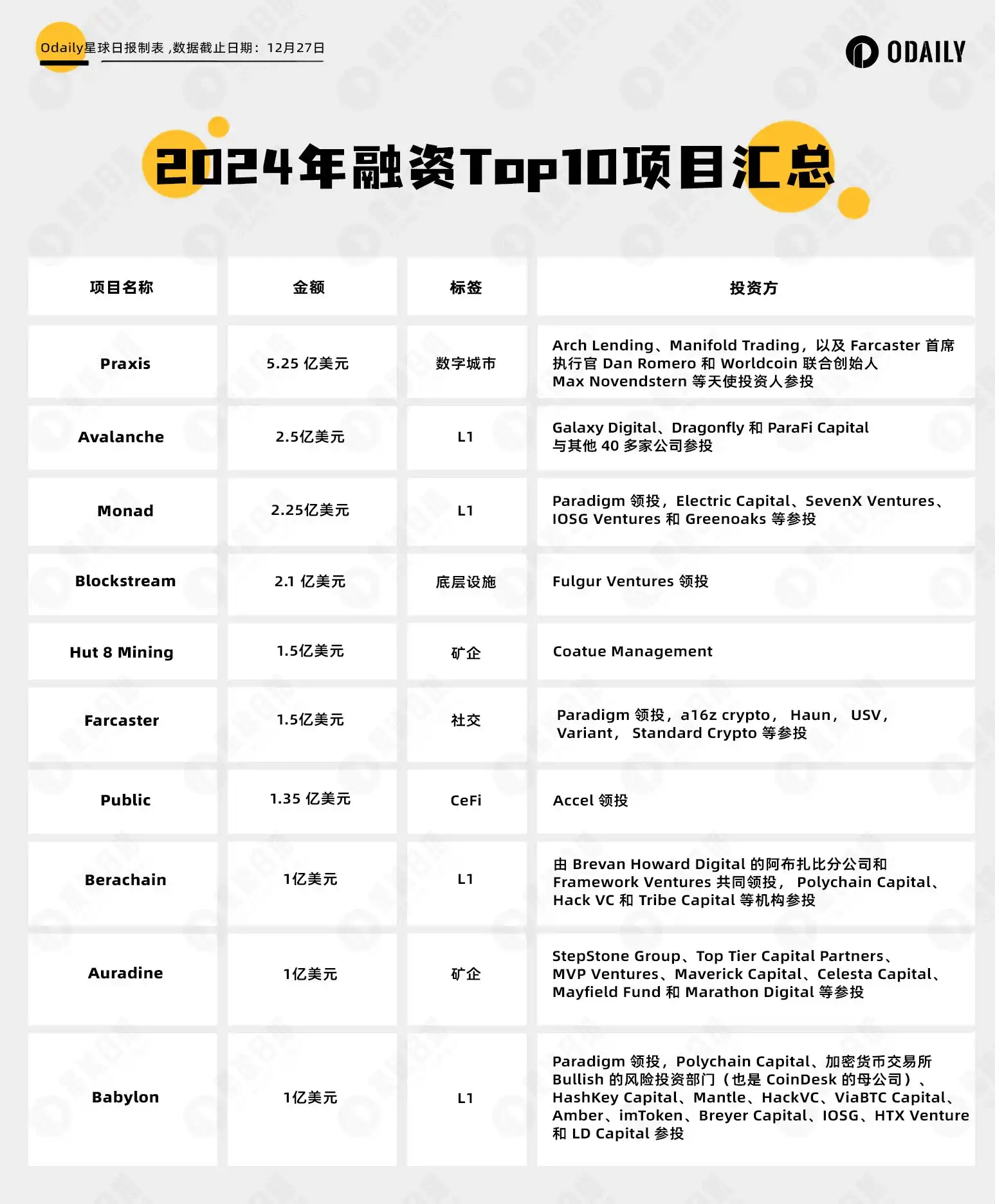 回看 2024 年 一级市场投融资活动,Odaily 星球日报发现: