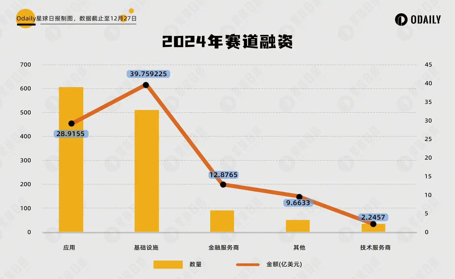 据 Odaily 星球日报不完全统计, 2024 年全球加密市场共发生 1295 起投融资事件(不含基金募资及并购),已披露总金额为 93.46 亿美元,分布在基础设施、技术服务商、金融服务商、应用和其他服务商赛道,其中应用赛道获得的融资数量最多,共计 606 笔;基础设施赛道获得的融资金额最多,融资金额为 39.76 亿美元。两者在融资金额和数量上领先其他赛道。
