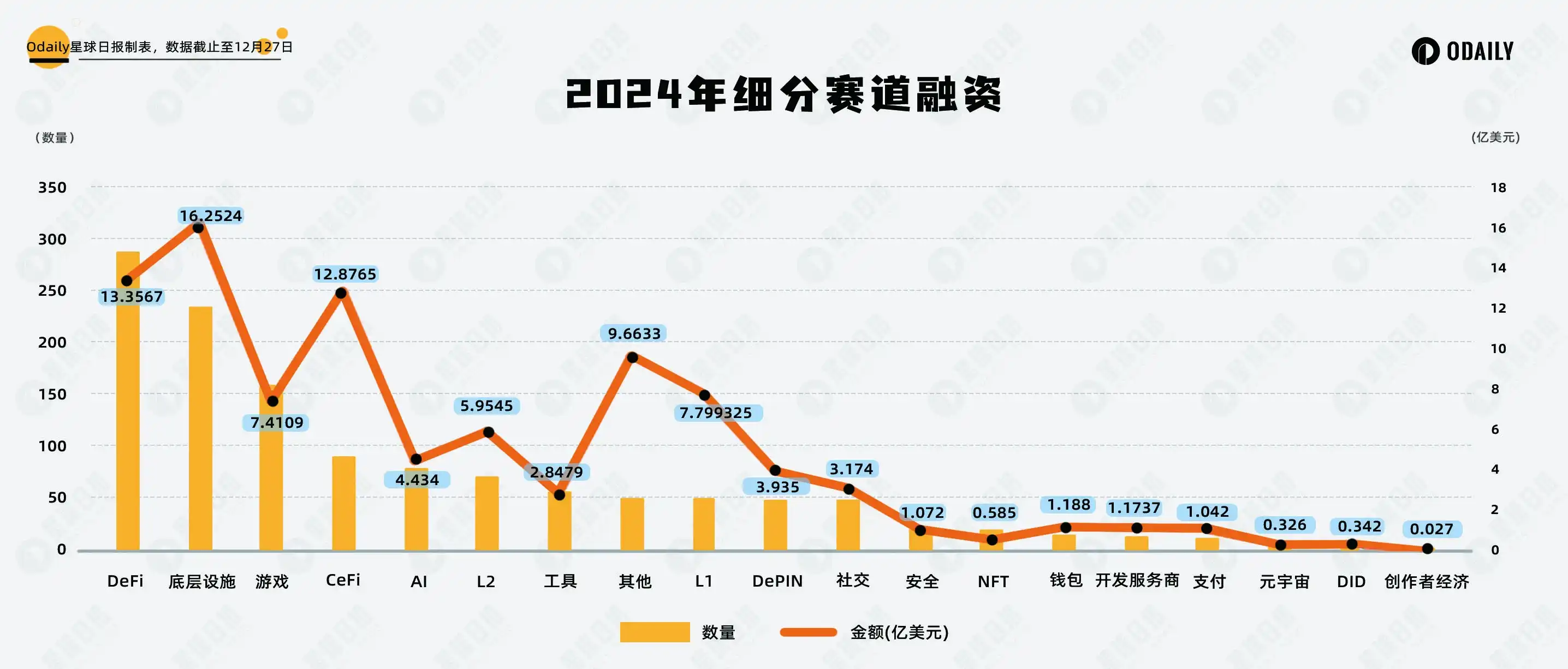 据 Odaily 星球日报不完全统计, 2024 年细分赛道中融资事件集中在 DeFi、底层设施和游戏,其中 DeFi 赛道为 289 笔,底层设施赛道为 236 笔,GameFi 赛道为 160 笔。